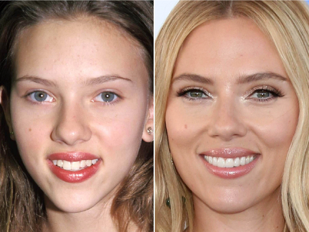 De glimlach van Scarlett Johansson veranderde geleidelijk. Eerst leek slechts één tand te zijn gecorrigeerd, samen met kleine